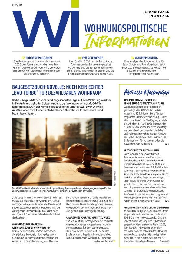 Immer auf dem aktuellsten Stand: Die WI Wohnungspolitische Informationen bieten Entscheidern in der Wohnungs- und Immobilienwirtschaft als einziger deutscher wohnungspolitischer Informationsdienst übersichtlich aufbereitete Informationen zu den verschiedensten branchenrelevanten Themen. Woche für Woche, 51 mal im Jahr.
